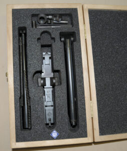 in Holzkassette, mit Erma Anstecknadel, Lauf blank, leichte Altersspuren, Beschuß 90, VB